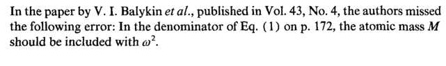 In the paper by V. I. Balykin et al., published in Vol. 43, No. 4, the authors missed the following error: In the denominator of Eq. (1) on p. 172, the atomic mass Μ should be included with ω2.