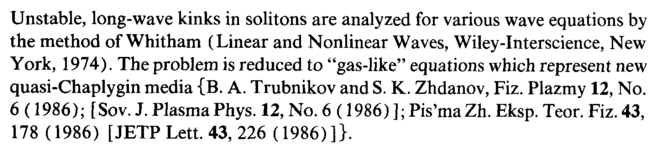 Unstable, long-wave kinks in solitons are analyzed for various wave equations by the method of Whitham (Linear and Nonlinear Waves, Wiley-Interscience, New York, 1974). The problem is reduced to "gas-like" equations which represent new quasi-Chaplygin media {B. A. Trubnikov and S. K. Zhdanov, Fiz. Plazmy 12, No. 6 (1986); [Sov. J. Plasma Phys. 12, No. 6 (1986) ]; Pis'maZh. Eksp. Teor. Fiz. 43, 178 (1986) [JETP Lett. 43, 226 (1986)]}.