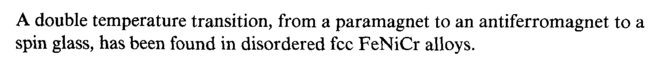 A double temperature transition, from a paramagnet to an antiferromagnet to a spin glass, has been found in disordered fee FeNiCr alloys.
