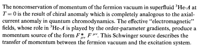 The nonconservation of momentum of the fermion vacuum in superfluid 3He-A at Τ = 0 is the result of chiral anomaly which is completely analogous to the axial-current anomaly in quantum chromodynamics. The effective "electromagnetic" fields, whose role in 3He-A is played by the order-parameter gradients, produce a momentum source of the form F*v F μν. This Schwinger source describes the transfer of momentum between the fermion vacuum and the excitation system.