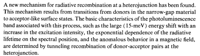 A new mechanism for radiative recombination at a heterojunction has been found. This mechanism results from transitions from donors in the narrow-gap material to acceptor-like surface states. The basic characteristics of the photoluminescence band associated with this process, such as the large (15-meV) energy shift with an increase in the excitation intensity, the exponential dependence of the radiative lifetime on the spectral position, and the anomalous behavior in a magnetic field, are determined by tunneling recombination of donor-acceptor pairs at the heterojunction.