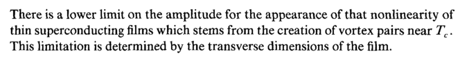 There is a lower limit on the amplitude for the appearance of that nonlinearity of thin superconducting films which stems from the creation of vortex pairs near Tc. This limitation is determined by the transverse dimensions of the film.