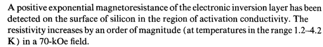 A positive exponential magnetoresistance of the electronic inversion layer has been detected on the surface of silicon in the region of activation conductivity. The resistivity increases by an order of magnitude (at temperatures in the range 1.2-4.2 K) ina70-kOe field.