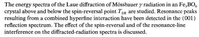 The energy spectra of the Laue diffraction of Mossbauer γ radiation in an Fe3B06 crystal above and below the spin-reversal point TSR are studied. Resonance peaks resulting from a combined hyperfine interaction have been detected in the (001) reflection spectrum. The effect of the spin-reversal and of the resonance-line interference on the diffracted-radiation spectra is discussed.