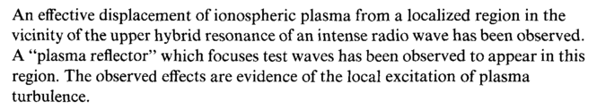 An effective displacement of ionospheric plasma from a localized region in the vicinity of the upper hybrid resonance of an intense radio wave has been observed. A "plasma reflector" which focuses test waves has been observed to appear in this region. The observed effects are evidence of the local excitation of plasma turbulence.