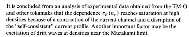 It is concluded from an analysis of experimental data obtained from the TM-G and other tokamaks that the dependence rE(ne) reaches saturation at high densities because of a contraction of the current channel and a disruption of the "self-consistent" current profile. Another important factor may be the excitation of drift waves at densities near the Murakami limit.