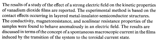 The results of a study of the effect of a strong electric field on the kinetic properties of vanadium dioxide films are reported. The experimental method is based on the contact effects occurring in layered metal-insulator-semiconductor structures. The conductivity, magnetoresistance, and nonlinear resistance properties of the samples were found to behave anomalously in an electric field. The results are discussed in terms of the concept of a spontaneous macroscopic current in the films induced by the transition of the system to the toroidal current state.