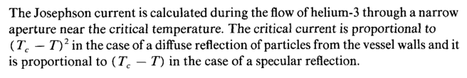 The Josephson current is calculated during the flow of helium-3 through a narrow aperture near the critical temperature. The critical current is proportional to (Tc — T)2 in the case of a diffuse reflection of particles from the vessel walls and it is proportional to (Tc — T) in the case of a specular reflection.