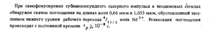 При самофокусировке субнаносекундного лазерного импульса в неодимовых стеклах обнаружен скачок поглощения на длинах волн 0,66 мкм и 1,053 мкм, обусловленный заселением нижнего уровня рабочего перехода 4/][ ί j иона Nd 3 +. Релаксация поглощения происходит с постоянной времени τ >, 10" 8 с.