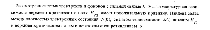 Рассмотрена система электронов и фононов с сильной связью λ > 1. Температурная зависимость верхнего критического поля Η имеет положительную кривизну. Найдена связь между плотностью электронных состояний Μ (О), скачком теплоемкости АС, нижним Η и верхним критическим полем и остаточным сопротивлением ρ .