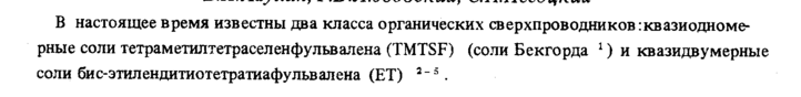В настоящее время известны два класса органических сверхпроводников :квазиодномерные соли тетраметилтетраселенфульвалена (TMTSF) (соли Бекгорда 1) и квазидв у мерные соли бис-этилендитиотетратиафульвалена (ЕТ) 2-5.