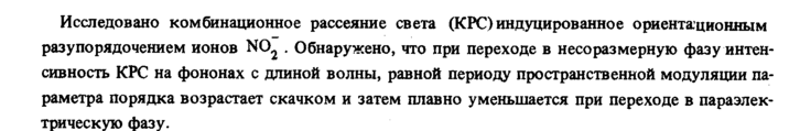 Исследовано комбинационное рассеяние света (КPC) индуцированное ориентационяьш разупорядочением ионов N02 . Обнаружено, что при переходе в несоразмерную фазу интенсивность КРС на фононах с длиной волны, равной периоду пространственной модуляции параметра порядка возрастает скачком и затем плавно уменьшается при переходе в параэлек-трическую фазу.