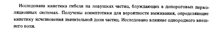 Исследована кинетика гибели на ловушках частиц, блуждающих в допороговых перко-ляционных системах. Получены асимптотики для вероятности выживания, определяющие кинетику исчезновения значительной доли частиц. Исследовано влияние однородного внешнего поля.