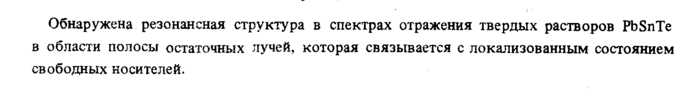 Обнаружена резонансная структура в спектрах отражения твердых растворов PbSnTe в области полосы остаточных лучей, которая связывается с локализованным состоянием свободных носителей.