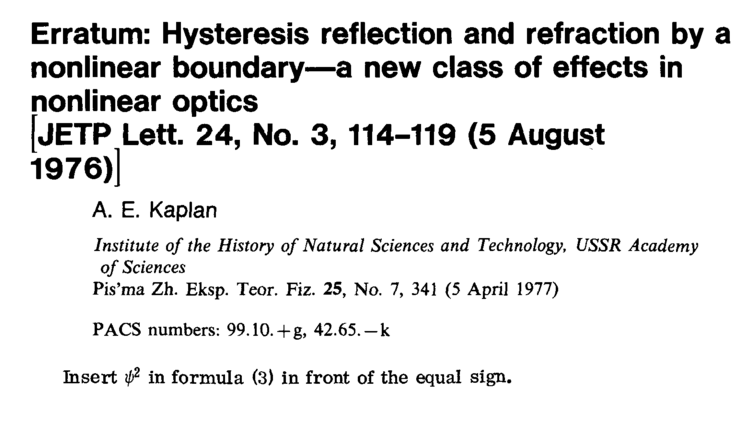 Erratum: Hysteresis reflection and refraction by a nonlinear boundary—a new class of effects in nonlinear optics [JETP Lett. 24, No. 3, 114-119 (5 August 1976)] A. E. Kaplan Institute of the History of Natural Sciences and Technology, USSR Academy of Sciences Pis'ma Zh. Eksp. Teor. Fiz. 25, No. 7, 341 (5 April 1977) PACS numbers: 99.10. + g, 42.65.-k Insert 02 in formula (3) in front of the equal sign.