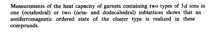 Measurements of the heat capacity of garnets containing two types of 3d ions in one (octahedral) or two (octaand dodecahedral) sublattices shows that an antiferromagnetic ordered state of the cluster type is realized in these compounds.