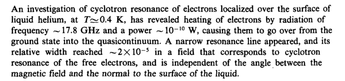 An investigation of cyclotron resonance of electrons localized over the surface of liquid helium, at 7Ъ^0.4 К, has revealed heating of electrons by radiation of frequency ~ 17.8 GHz and a power ~10-10 W, causing them to go over from the ground state into the quasicontinuum. A narrow resonance line appeared, and its relative width reached ~ 2XlO~5 in a field that corresponds to cyclotron resonance of the free electrons, and is independent of the angle between the magnetic field and the normal to the surface of the liquid.