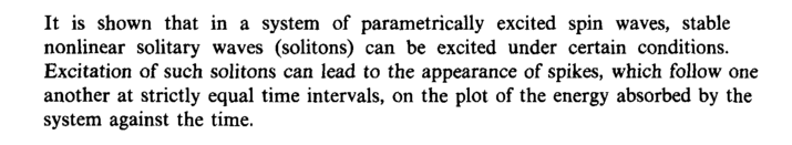 It is shown that in a system of parametrically excited spin waves, stable nonlinear solitary waves (solitons) can be excited under certain conditions. Excitation of such solitons can lead to the appearance of spikes, which follow one another at strictly equal time intervals, on the plot of the energy absorbed by the system against the time.