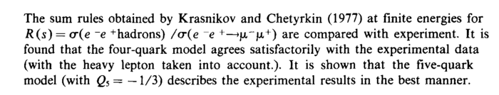 The sum rules obtained by Krasnikov and Chetyrkin (1977) at finite energies for R(s) = σ(β ~e +hadrons) /cr(e ~e +—>μ~μ+) are compared with experiment. It is found that the four-quark model agrees satisfactorily with the experimental data (with the heavy lepton taken into account.). It is shown that the five-quark model (with Q5 = —1/3) describes the experimental results in the best manner.