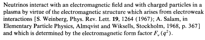 Neutrinos interact with an electromagnetic field and with charged particles in a plasma by virtue of the electromagnetic structure which arises from electroweak interactions [S. Weinberg, Phys. Rev. Lett. 19, 1264 (1967); A. Salam, in Elementary Particle Physics, Almqvist and Wiksells, Stockholm, 1968, p. 367] and which is determined by the electromagnetic form factor Fv(q2).