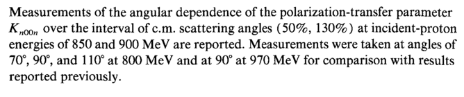 Measurements of the angular dependence of the polarization-transfer parameter Kn00n over the interval of cm. scattering angles (50%, 130%) at incident-proton energies of 850 and 900 MeV are reported. Measurements were taken at angles of 70°, 90°, and 110° at 800 MeV and at 90° at 970 MeV for comparison with results reported previously.