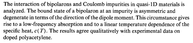 The interaction of bipolarons and Coulomb impurities in quasi-ID materials is analyzed. The bound state of a bipolaron at an impurity is asymmetric and degenerate in terms of the direction of the dipole moment. This circumstance gives rise to a low-frequency absorption and to a linear temperature dependence of the specific heat, c(T). The results agree qualitatively with experimental data on doped polyacetylene.