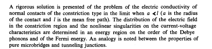 A rigorous solution is presented of the problem of the electric conductivity of normal contacts of the constriction type in the limit when a 41 (a is the radius of the contact and / is the mean free path). The distribution of the electric field in the constriction region and the nonlinear singularities on the current-voltage characteristics are determined in an energy region on the order of the Debye phonons and of the Fermi energy. An analogy is noted between the properties of pure microbridges and tunneling junctions.