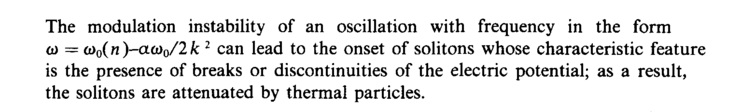 The modulation instability of an oscillation with frequency in the form ω = a>o(«)-aaj0/2fc 2 can lead to the onset of solitons whose characteristic feature is the presence of breaks or discontinuities of the electric potential; as a result, the solitons are attenuated by thermal particles.