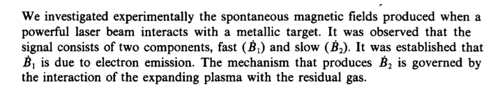 We investigated experimentally the spontaneous magnetic fields produced when a powerful laser beam interacts with a metallic target. It was observed that the signal consists of two components, fast and slow (B2). It was established that Β ι is due to electron emission. The mechanism that produces B2 is governed by the interaction of the expanding plasma with the residual gas.