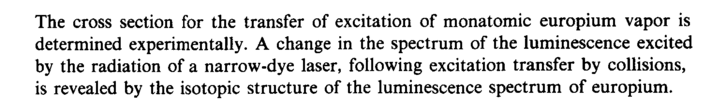 The cross section for the transfer of excitation of monatomic europium vapor is determined experimentally. A change in the spectrum of the luminescence excited by the radiation of a narrow-dye laser, following excitation transfer by collisions, is revealed by the isotopic structure of the luminescence spectrum of europium.