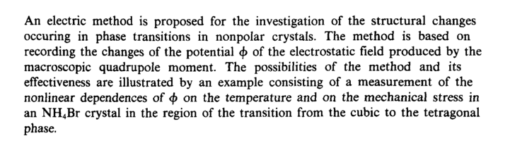 An electric method is proposed for the investigation of the structural changes occuring in phase transitions in nonpolar crystals. The method is based on recording the changes of the potential φ of the electrostatic field produced by the macroscopic quadrupole moment. The possibilities of the method and its effectiveness are illustrated by an example consisting of a measurement of the nonlinear dependences of φ on the temperature and on the mechanical stress in an NH4Br crystal in the region of the transition from the cubic to the tetragonal phase.