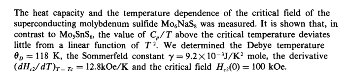 The heat capacity and the temperature dependence of the critical field of the superconducting molybdenum sulfide Mo6NaS8 was measured. It is shown that, in contrast to Mo5SnS6, the value of Cp/T above the critical temperature deviates little from a linear function of Γ2. We determined the Debye temperature 0D = 118 K, the Sommerfeld constant у = 9.2 X 10"3J/K2 mole, the derivative (dHc2/dT)T= Tc = 12.8kOe/K and the critical field Яс2(0) = 100 kOe.