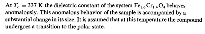At Tc = 337 К the dielectric constant of the system Fe1.6Cr1>404 behaves anomalously. This anomalous behavior of the sample is accompanied by a substantial change in its size. It is assumed that at this temperature the compound undergoes a transition to the polar state.