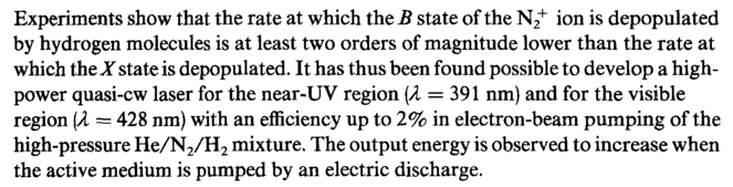 Experiments show that the rate at which the В state of the N2+ ion is depopulated by hydrogen molecules is at least two orders of magnitude lower than the rate at which the X state is depopulated. It has thus been found possible to develop a high-power quasi-cw laser for the near-UV region (Я = 391 nm) and for the visible region (λ = 428 nm) with an efficiency up to 2% in electron-beam pumping of the high-pressure He/N2/H2 mixture. The output energy is observed to increase when the active medium is pumped by an electric discharge.