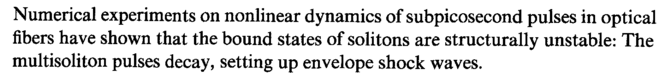 Numerical experiments on nonlinear dynamics of subpicosecond pulses in optical fibers have shown that the bound states of solitons are structurally unstable: The multisoliton pulses decay, setting up envelope shock waves.
