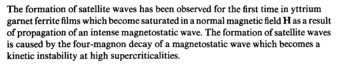 The formation of satellite waves has been observed for the first time in yttrium garnet ferrite films which become saturated in a normal magnetic field Η as a result of propagation of an intense magnetostatic wave. The formation of satellite waves is caused by the four-magnon decay of a magnetostatic wave which becomes a kinetic instability at high supercriticalities.