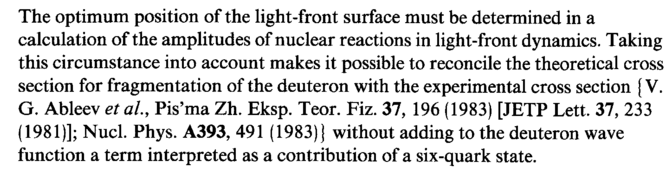 The optimum position of the light-front surface must be determined in a calculation of the amplitudes of nuclear reactions in light-front dynamics. Taking this circumstance into account makes it possible to reconcile the theoretical cross section for fragmentation of the deuteron with the experimental cross section {V. G. Ableev etal, Pis'ma Zh. Eksp. Teor. Fiz. 37, 196 (1983) [JETP Lett. 37, 233 (1981)]; Nucl. Phys. A393, 491 (1983) j without adding to the deuteron wave function a term interpreted as a contribution of a six-quark state.
