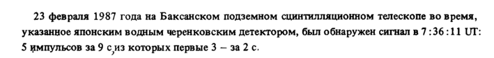 23 февраля 1987 года на Баксанском подземном сцинтилляционном телескопе во время, указанное японским водным черенковским детектором, был обнаружен сигнал в 7 :36:11 UT: 5 импульсов за 9 сиз которых первые 3 за 2 с,