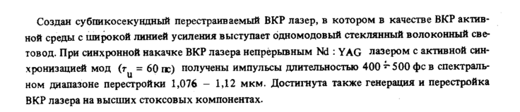 Создан су бпи ко секундный перестраиваемый ВКР лазер, в котором в качестве ВКР активной среды с широкой линией усиления выступает одномодовый стеклянный волоконный световод. При синхронной накачке ВКР лазера непрерывным Nd : YAG лазером с активной синхронизацией мод (т = 60 пс) получены импульсы длительностью 400^500фсв спектральном диапазоне перестройки 1,076 1,12 мкм. Достигнута также генерация и перестройка ВКР лазера на высших стоксовых компонентах.