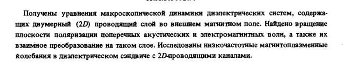 Получены уравнения макроскопической динамики диэлектрических систем, содержащих двумерный {2D) проводящий слой во внешнем магнитном поле. Найдено вращение плоскости поляризации поперечных акустических и электромагнитных волн, а также их взаимное преобразование на таком слое. Исследованы низкочастотные магнитоплазменные колебания в диэлектрическом сэндвиче с 2/)*проводящими каналами.