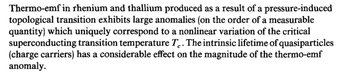Thermo-emf in rhenium and thallium produced as a result of a pressure-induced topological transition exhibits large anomalies (on the order of a measurable quantity) which uniquely correspond to a nonlinear variation of the critical superconducting transition temperature Tc. The intrinsic lifetime of quasiparticles (charge carriers) has a considerable effect on the magnitude of the thermo-emf anomaly.