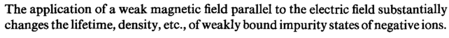 The application of a weak magnetic field parallel to the electric field substantially changes the lifetime, density, etc., of weakly bound impurity states of negative ions.