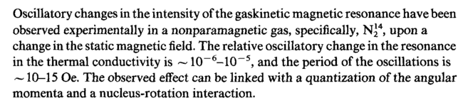 Oscillatory changes in the intensity of the gaskinetic magnetic resonance have been observed experimentally in a nonparamagnetic gas, specifically, N24, upon a change in the static magnetic field. The relative oscillatory change in the resonance in the thermal conductivity is ~ 10_6-10-5, and the period of the oscillations is —10-15 Oe. The observed effect can be linked with a quantization of the angular momenta and a nucleus-rotation interaction.