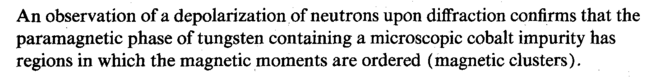 An observation of a depolarization of neutrons upon diffraction confirms that the paramagnetic phase of tungsten containing a microscopic cobalt impurity has regions in which the magnetic moments are ordered (magnetic clusters).