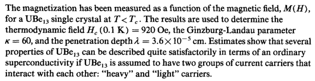 The magnetization has been measured as a function of the magnetic field, M{H), for a UBe13 single crystal at T< Tc. The results are used to determine the thermodynamic field ЯС(0.1К)= 920 Oe, the Ginzburg-Landau parameter к = 60, and the penetration depth Я = 3.6 X 10~5 cm. Estimates show that several properties of UBe13 can be described quite satisfactorily in terms of an ordinary superconductivity if UBe13 is assumed to have two groups of current carriers that interact with each other: "heavy" and "light" carriers.