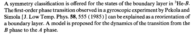 A symmetry classification is offered for the states of the boundary layer in 3He-B. The first-order phase transition observed in a gyroscopic experiment by Pekola and Simola [J. Low Temp. Phys. 58, 555(1985)] can be explained as a reorientation of a boundary layer. A model is proposed for the dynamics of the transition from the В phase to the A phase.