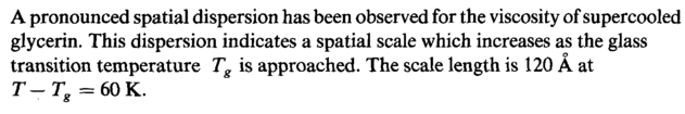 A pronounced spatial dispersion has been observed for the viscosity of supercooled glycerin. This dispersion indicates a spatial scale which increases as the glass _ __ о transition temperature Tg is approached. The scale length is 120 A at Τ — Tx =60K.