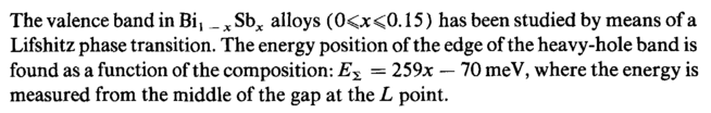 The valence band in Bi{ _xSbx alloys (0<χ<0.15) has been studied by means of a Lifshitz phase transition. The energy position of the edge of the heavy-hole band is found as a function of the composition: Ετ = 259x — 70 meV, where the energy is measured from the middle of the gap at the L point.
