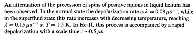 An attenuation of the precession of spins of positive muons in liquid helium has been observed. In the normal state the depolarization rate is Я = 0.08 μβ"1, while in the superfluid state this rate increases with decreasing temperature, reaching λ = 0.15 //s ~1 at Τ = 1.5 К. In He-II, this process is accompanied by a rapid depolarization with a scale time r~0.5 /is.