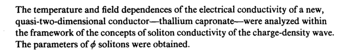 The temperature and field dependences of the electrical conductivity of a new, quasi-two-dimensional conductor—thallium capronate—were analyzed within the framework of the concepts of soliton conductivity of the charge-density wave. The parameters of φ solitons were obtained.